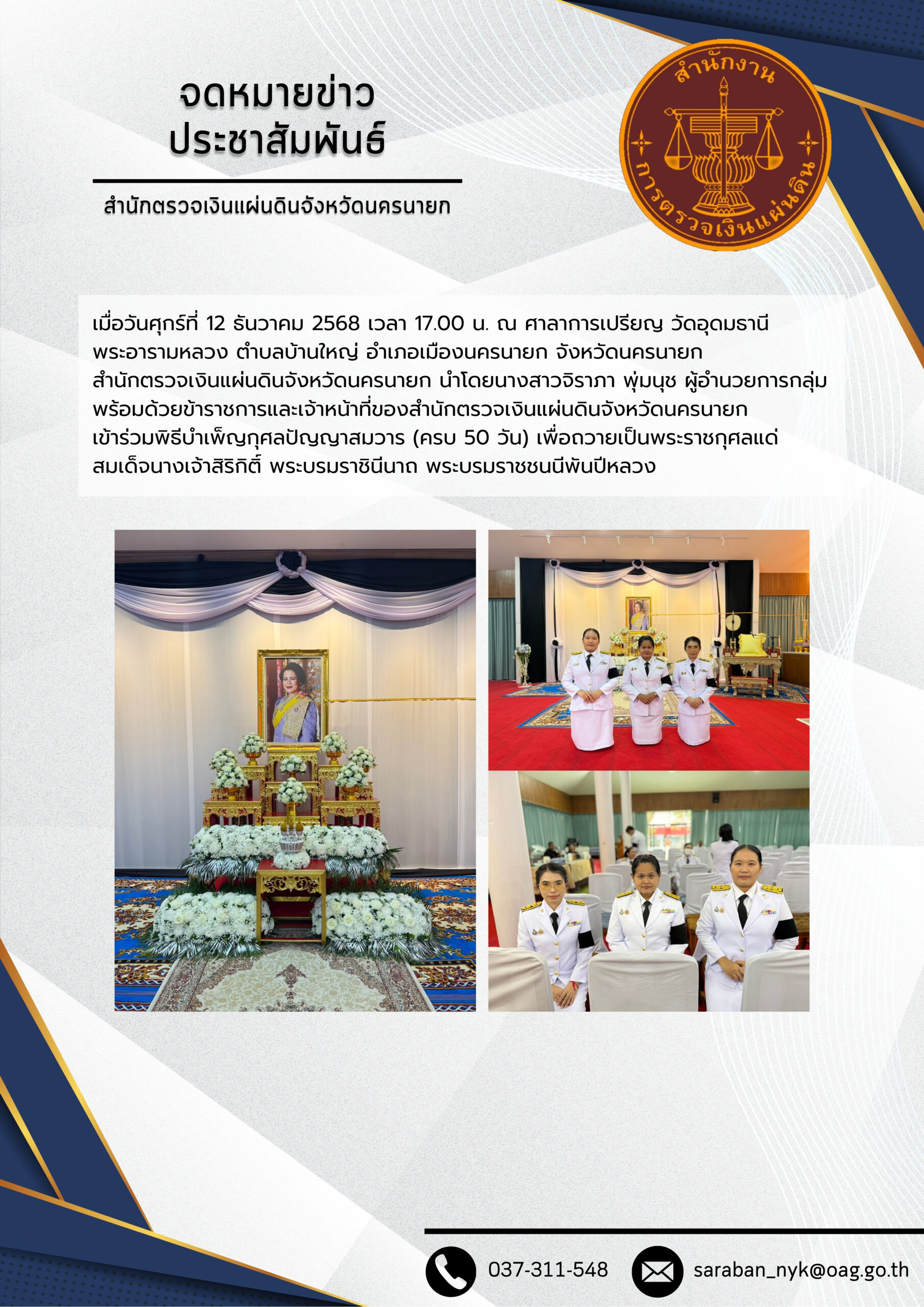 พิธีบำเพ็ญกุศลในวาระครบ 50 วันเพื่อถวายเป็นพระราชกุศลแด่สมเด็จพระนางเจ้าสิริกิติ์ พระบรมราชินีนาถ พระบรมราชชนนีพันปีหลวงกิจกรรมประชาสัมพันธ์, ข่าวประชาสัมพันธ์, งานราชพิธี/รัฐพิธี, ภาพกิจกรรม, อินโฟกราฟิกธันวาคม 13, 2025ธันวาคม 13, 2025 Post Views: 690